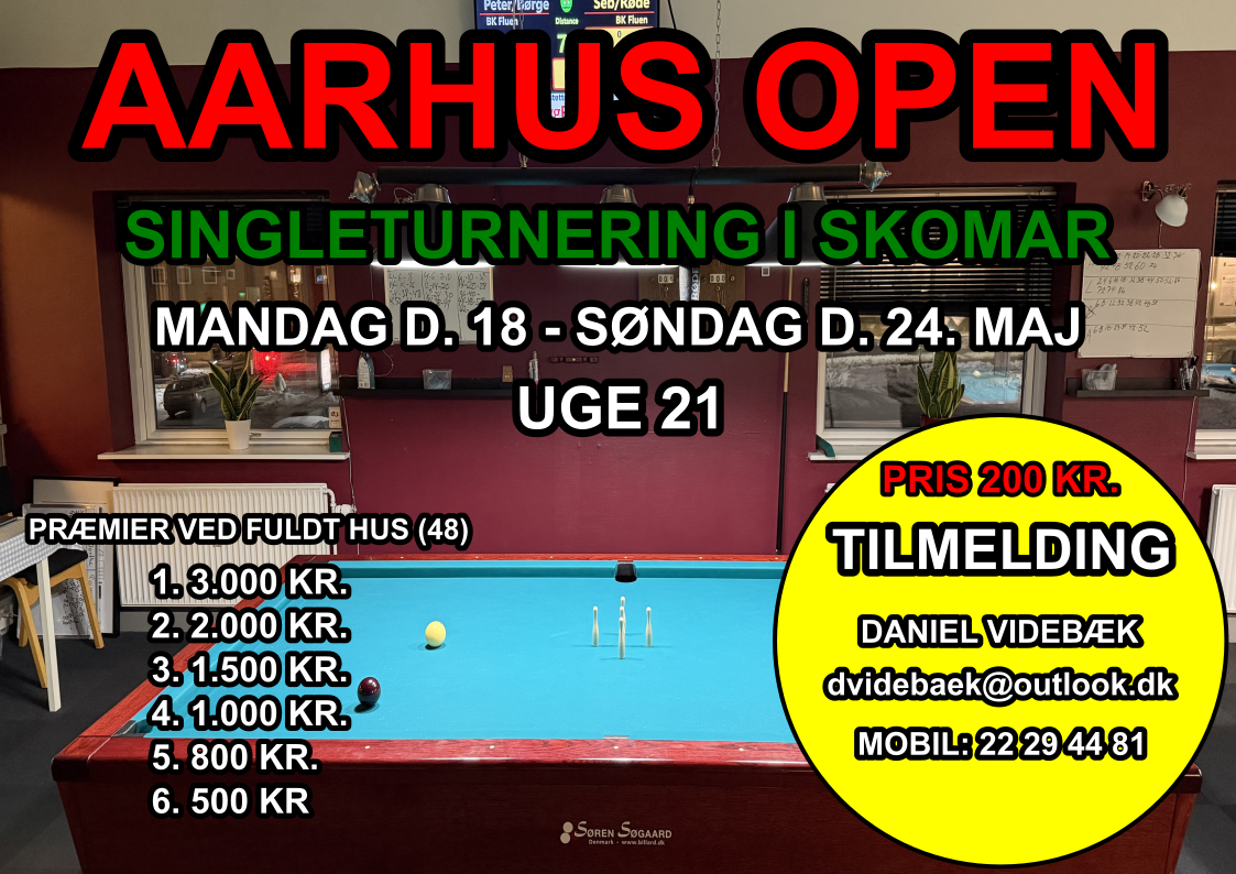 Blå Stue Team Billard CARLSBERG MARIELYST SUPERMASTERS 2026 Pris: kr. 600,- pr. deltager Max. 48 deltagere Pr. 23. marts 2026 VENTELISTE: 2 --- TILMELDING Sveske på telefon: 25476933 --- Vi […]