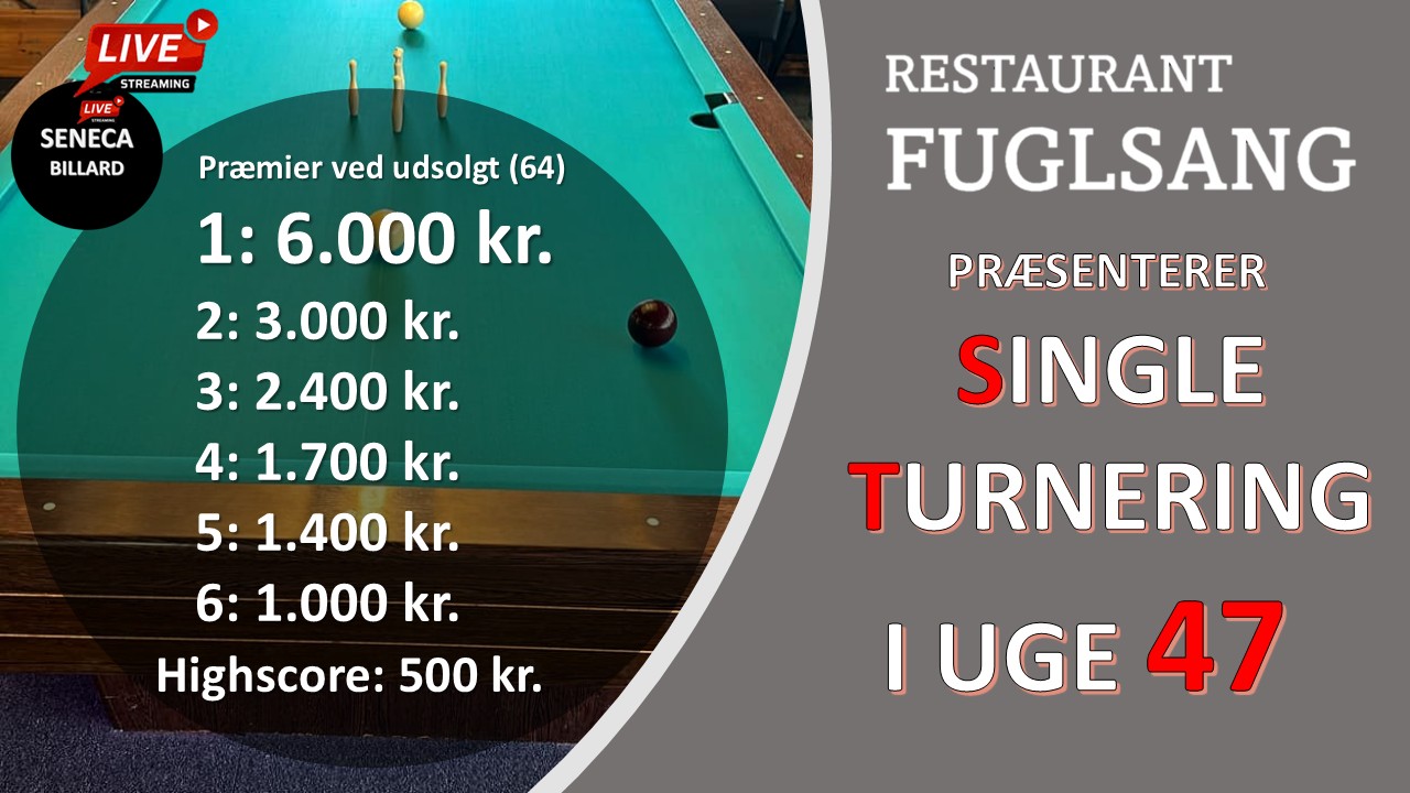 250 kr. Indledende puljer (Vælg en spilledag du ønsker at spille din indledende runde.) Søndag i uge 46 kl. 12.00, kl. 13.30, kl. 16,30 og kl. 18.00 Mandag til Torsdag i uge 47 Kl. 17.00 & 18.30 Fredag i uge 47 kl. kl. 12.00, kl. 13.30, kl. 16,30 og kl. 18.00 Finaledag Lørdag i uge […]